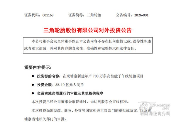2026年1月15日,三角轮胎的一则公告搅动了国内轮胎行业的神经。公司拟斥资32.19亿元人民币,在柬埔寨柴桢省投建一座年产700万条轮胎的制造基地,其中半钢子午线轮胎600万条、全钢子午线轮胎100万条。这是三角轮胎首个海外大型制造基地,标志着这家中国龙头胎企正式迈入全球化生产运营新阶段。