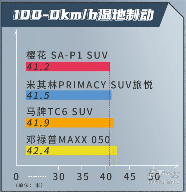 在100-0km/h湿地制动测试中,樱花SA-P1 SUV的制动距离为41.2米,为本次测试中最短成绩。