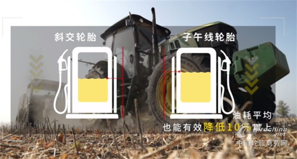 田间作业中,在相同胎压下,子午线轮胎收割机作业速度比斜交胎更快速,滑转率更低,有效降低了湿软田地陷车打滑风险。在道路和田间工况,配置胎压280kPa子午线轮胎的联合收割机牵引功率均显著提高,耗油率均显著降低。且在重载工况下仍能保持稳定油耗,综合燃油经济性突出。