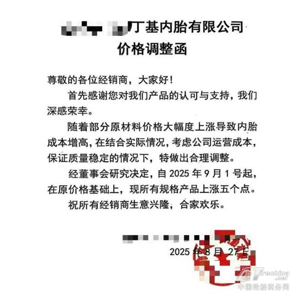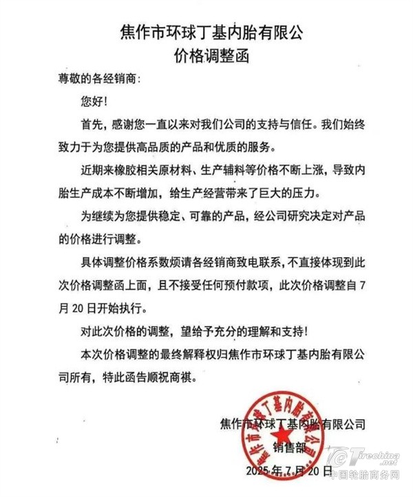 面对原材料成本的攀升,轮胎厂家也开始做出价格调整,目前已有多家丁基内胎企业如朝阳华兴万达、焦作市环球等率先提价3%-5%。
