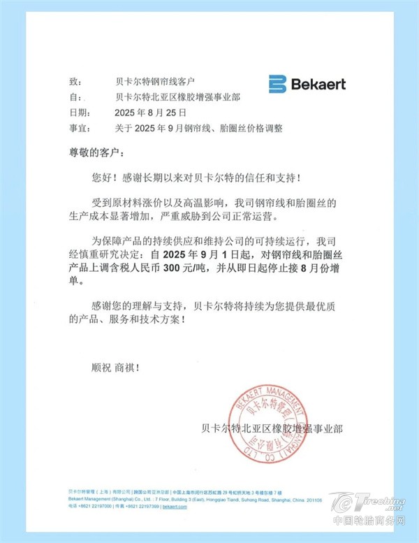 除了天然橡胶,炭黑作为轮胎增强和耐磨的重要添加剂,价格在今年三、四月跌至低位后,同样在近两个月持续攀升;此外,钢帘线巨头贝卡尔特发布2025年9月价格调整通知,公司将于9月1日起,对钢帘线和胎圈丝产品上调含税人民币300元/吨,并从即日起停止接受8月份新增订单。