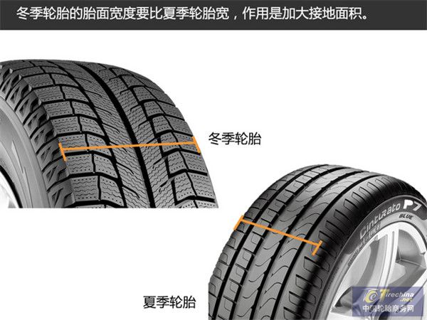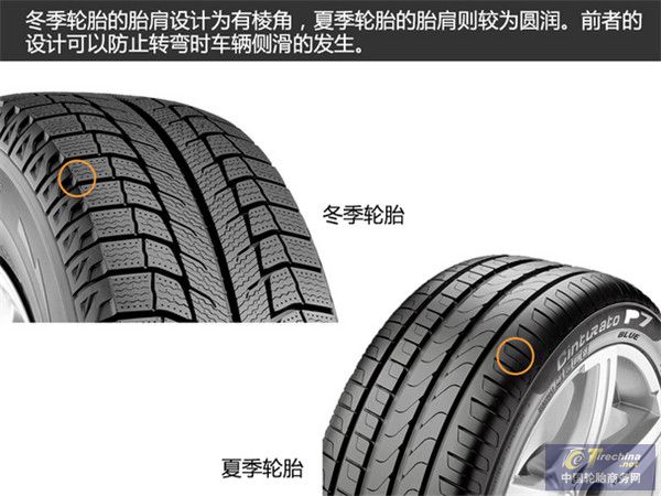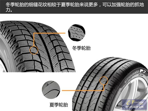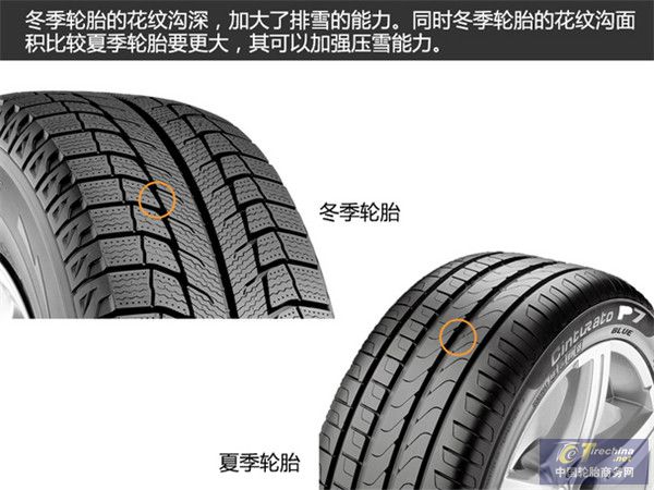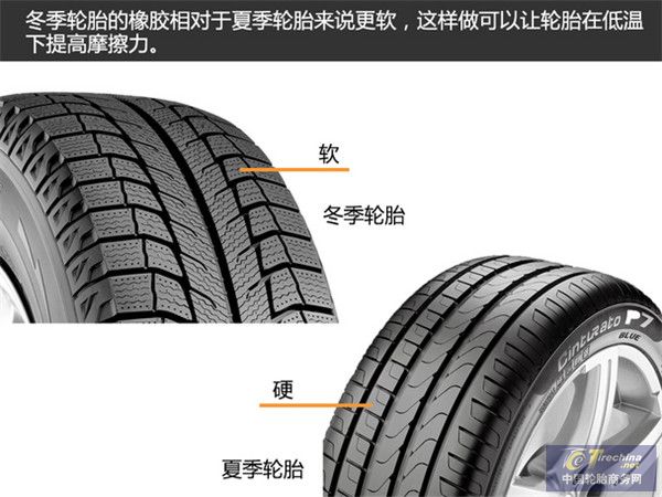冬季轮胎特殊的橡胶成分让其比夏季轮胎更软,不会像夏季轮胎那样被冻的硬梆梆而失去抓地力等。夏季轮胎沟槽浅,轮胎较硬,在冰雪路面容易产生打滑现象,并且制动距离也会比冬季轮胎更远。