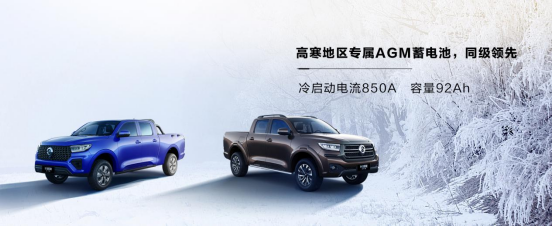 长城炮高寒版配备AGM大容量蓄电池。该电池低温性能更出色,冷启动电流可达850A,容量高达92Ah,性能同级领先,即使极寒条件下,也能一键启动;
