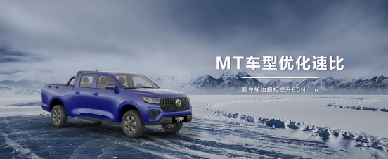 商用炮MT车型优化变速箱和前后桥速比,整车轮边扭矩提升60 N·m,有效提升冰雪路面的通过性;