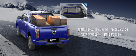 商用炮高寒版更是升级重载板簧,承载能力进一步加强,全新的防滚架设计增加了后窗防护栏,全方位保护车辆。