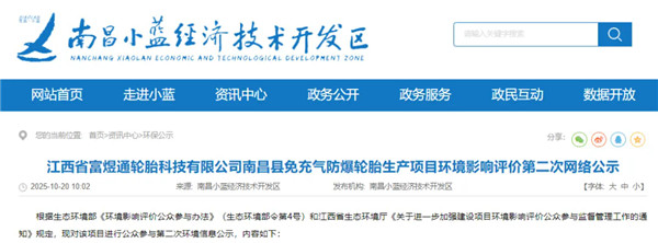 10 月 20 日,江西省富煜通轮胎科技有限公司 “免充气防爆轮胎生产项目” 进行第二次环评公示。