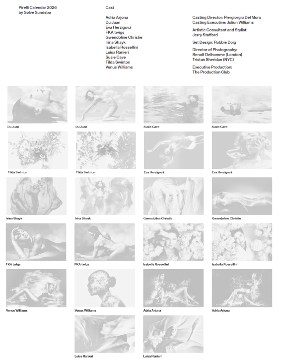 2026年年历由挪威摄影师Sølve Sundsbø掌镜,以"元素"为主题旨在探索人类与自然之间的交融。十一位年历模特化身自然元素与无形力量的象征载体——既呈现土、气、火、水四大基础元素,也诠释能量、以太与光线等抽象力量。
