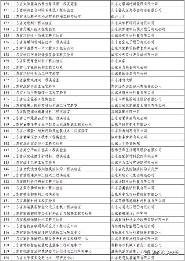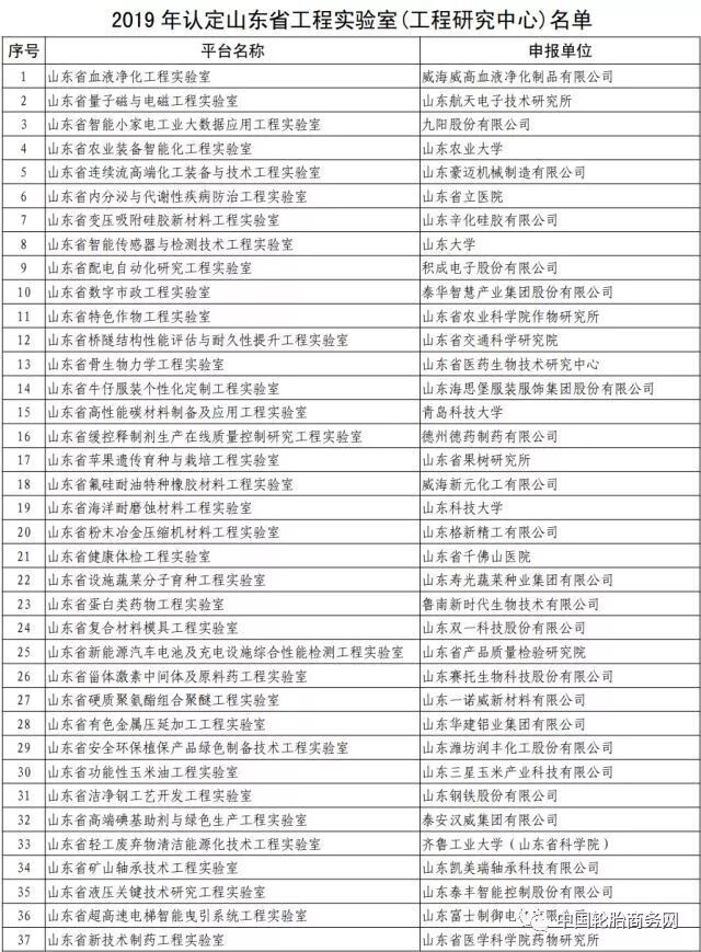 入选2019年认定山东省工程研究中心名单的企业包括山东圣泉新材料股份有限公司、浦林成山(山东)轮胎有限公司、山东贝隆杜仲生物工程有限公司、青岛双星轮胎工业有限公司。