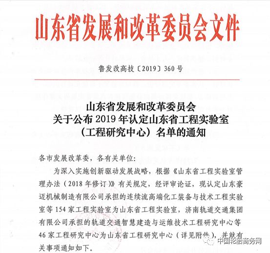 近日,为深入实施创新驱动发展战略,经评审论证,山东省发展和改革委员会公布了2019年认定山东省工程实验室(工程研究中心)名单,认定山东豪迈机械制造有限公司承担的连续流高端化工装备与技术工程实验室等154家工程实验室为山东省工程实验室,济南轨道交通集团有限公司承担的轨道交通智慧建造与运维技术工程研究中心等46家工程研究中心为山东省工程研究中心。