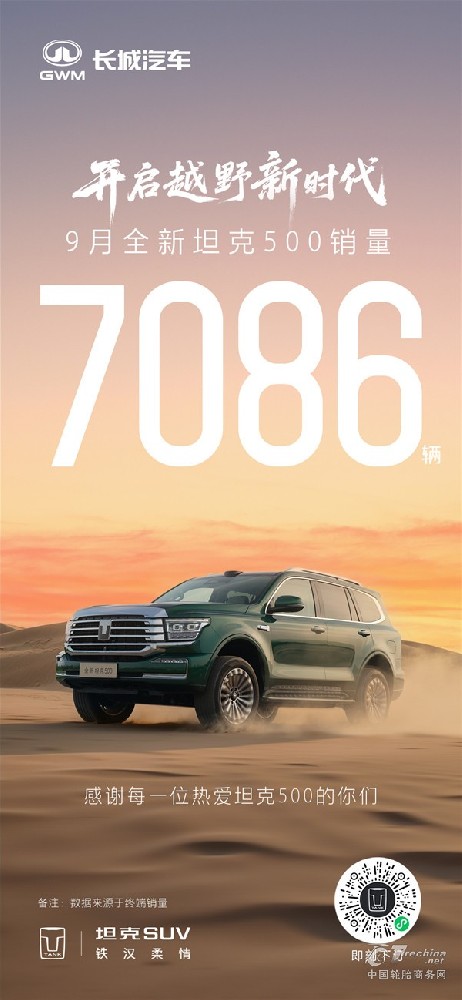2025年9月,坦克品牌再度交出亮眼成绩单:旗下重磅车型全新坦克500单月销量达7086辆,成为30万级以上新能源越野SUV市场中势头强劲的“销量标杆”。
