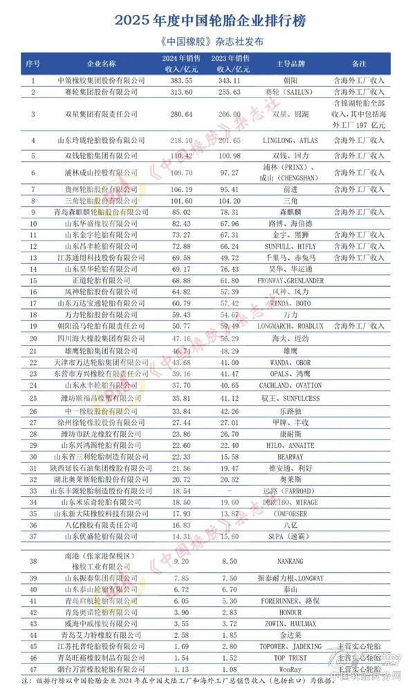 其中,“2025年度中国轮胎企业排行榜”,有47家企业参与排名,总销售收入为3035亿元,以2024年中国轮胎企业在中国大陆工厂和海外工厂轮胎业务总销售收入为依据。“2025年度中国境内轮胎企业排行榜”,针对在中国大陆设厂的所有轮胎企业(包括外资企业),以2024年企业在中国大陆工厂轮胎业务销售收入为依据。