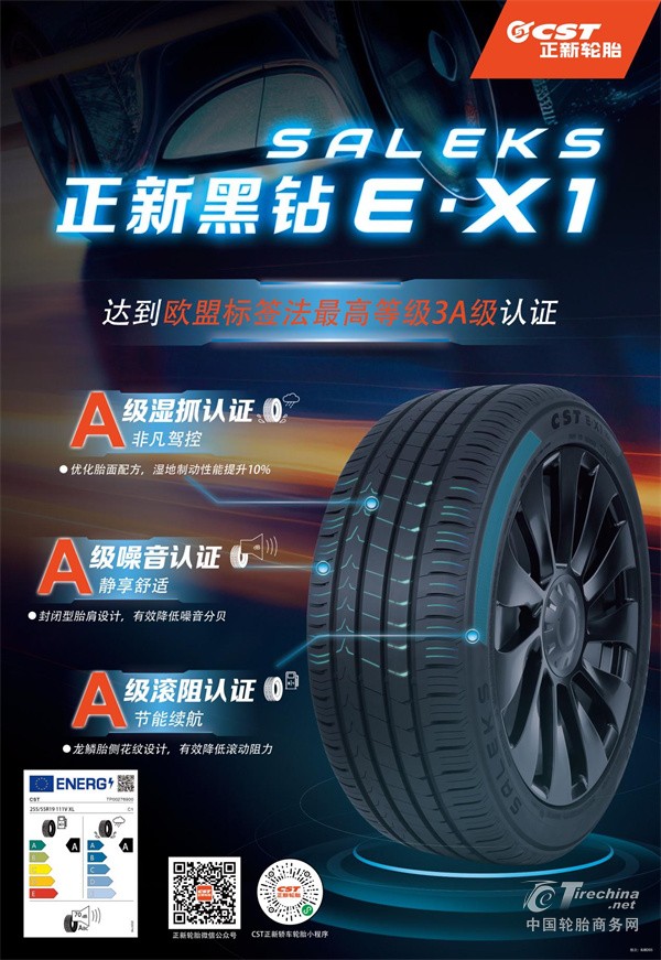 据了解,正新黑钻E·X1不仅在滚动阻力(能耗)、湿地制动(安全)、噪声(舒适)三大指标,达到欧盟轮胎标签法最高的A级标准,更以A级磨耗和售后保障构建“5A级”全能实力。