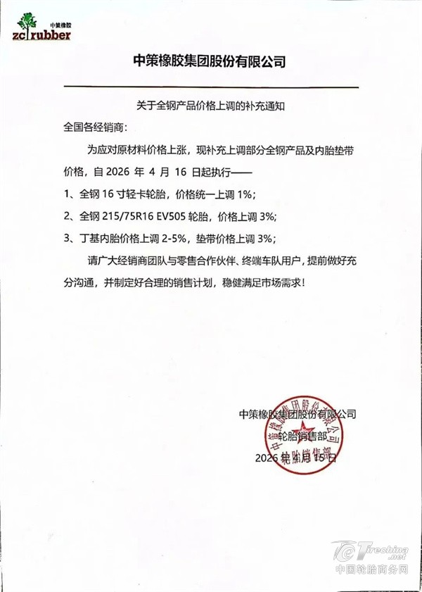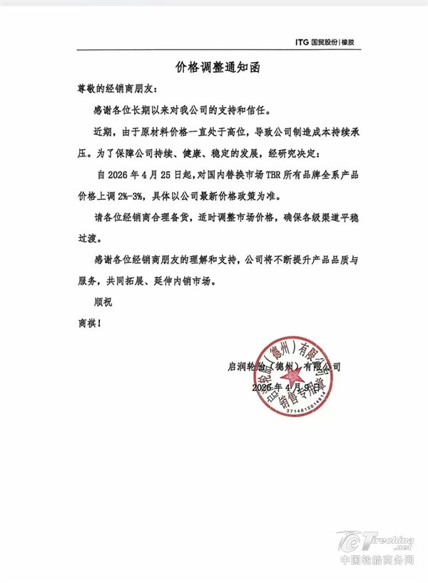 业内分析指出,本轮涨价并非单一企业行为,而是行业性成本压力的集中释放。当前国内 TBR 市场正处于替换需求复苏、成本端持续承压的关键节点,企业通过调价对冲成本压力,同时保障产品品质与供应链稳定。对于经销商而言,多家企业也在通知中提示合理备货、平稳过渡,避免市场价格出现大幅波动。