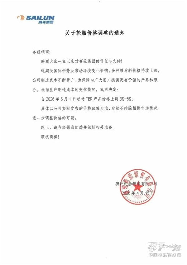 赛轮集团则从 5 月 1 日起,将 TBR 产品价格上调 3%-5%,同样提示了后续价格调整的可能性;