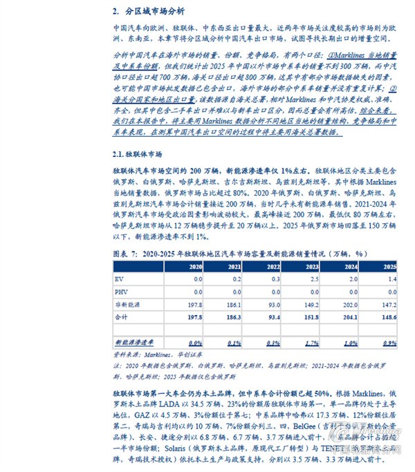 中国汽车向欧洲、独联体、中东西亚出口量最大,近两年市场关注度较高的市场则为欧洲、东南亚。正文分别分析了中国汽车七大出口市场,试图寻找长期出口的增量空间,并得出如下结论: