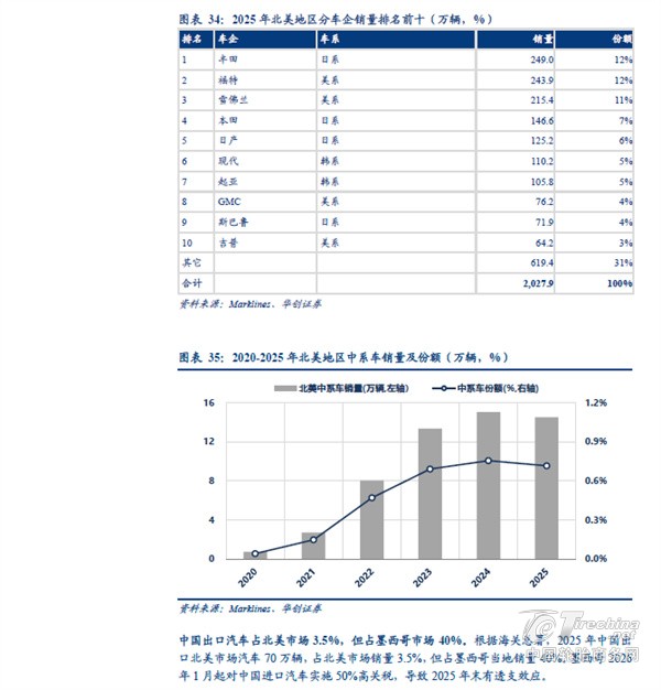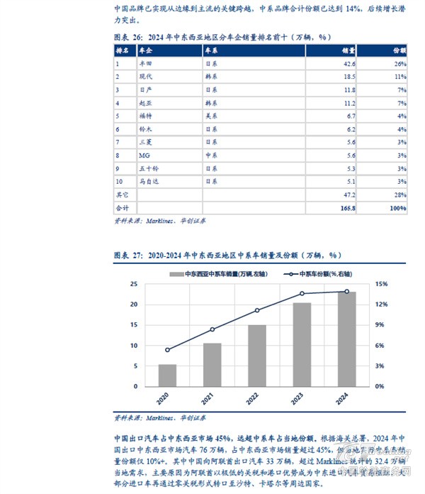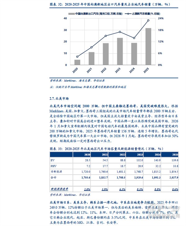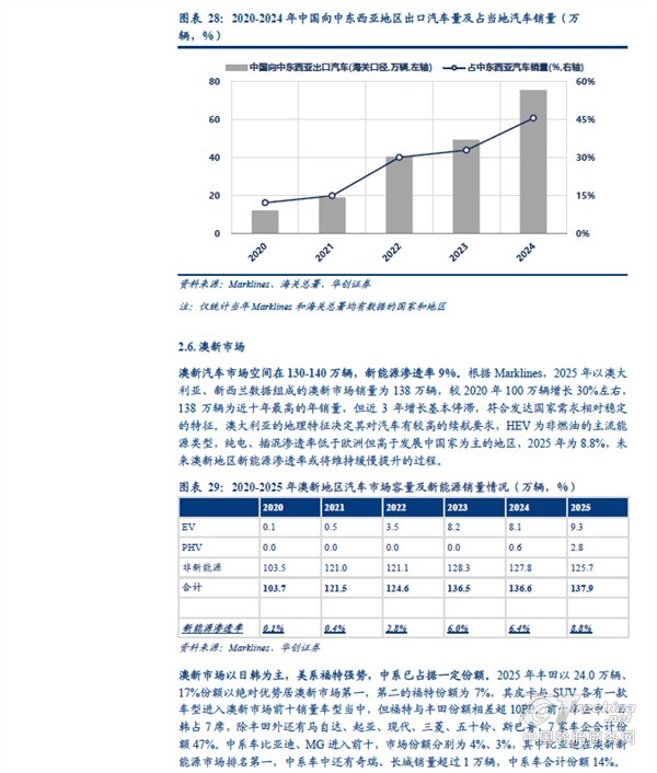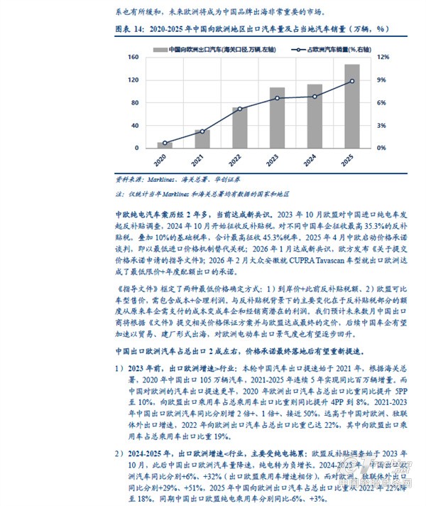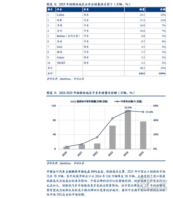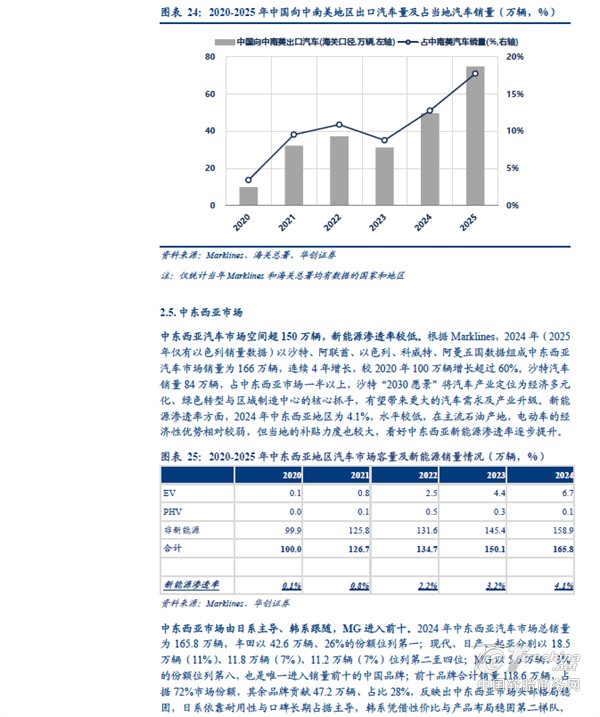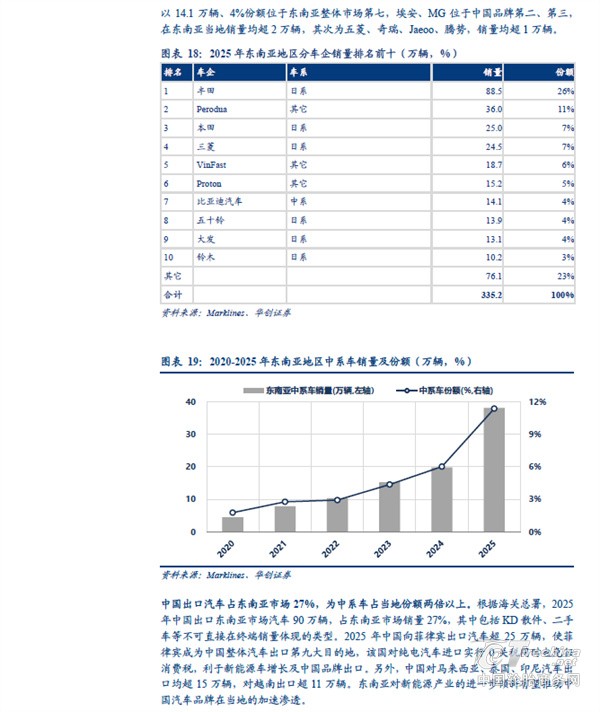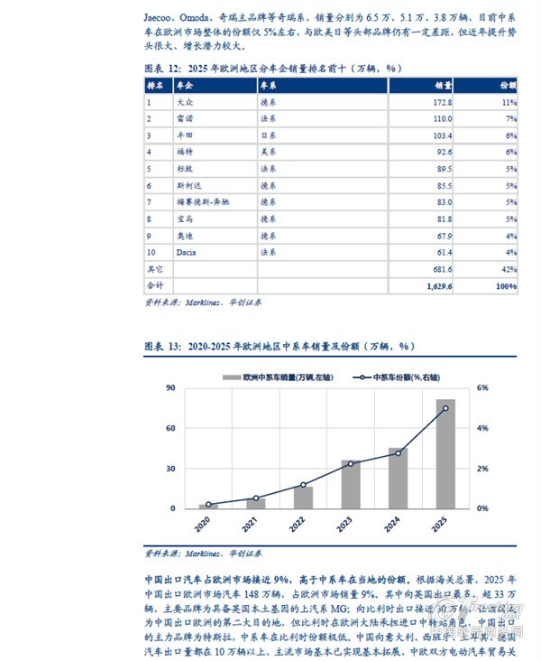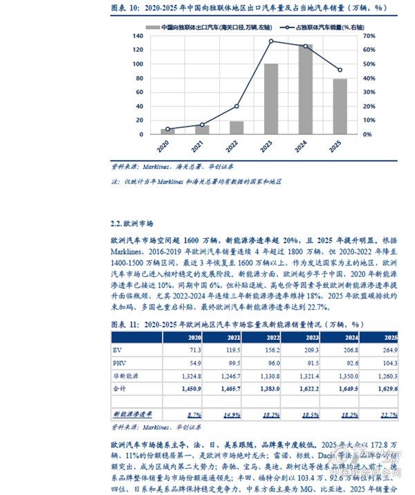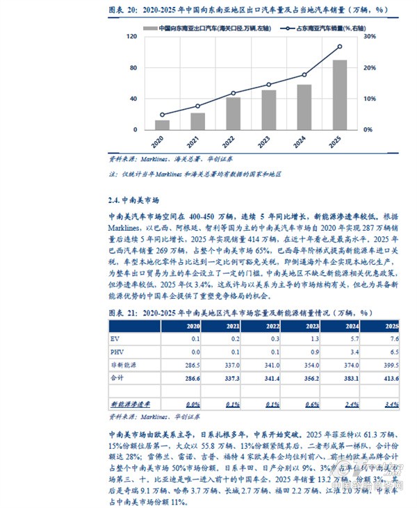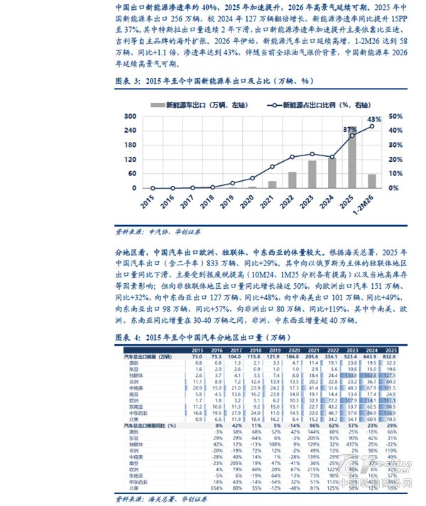 分地区看,中国汽车出口欧洲、独联体、中东西亚的体量较大。根据海关总署,2025 年中国汽车出口(含二手车)833 万辆、同比+29%。其中向以俄罗斯为主体的独联体地区出口量同比下滑,主要受到报废税提高以及当地高库存等因素影响;但向非独联体地区出口量同比增长接近50%,向欧洲出口汽车151 万辆、同比+32%,向中东西亚出口127 万辆、同比+48%,向中南美出口101 万辆、同比+49%,向东南亚出口198 万辆、同比+57%,向非洲出口80 万辆、同比+119%,其中中南美、欧洲、东南亚同比增量在30-40 万辆之间,非洲、中东西亚增量超40 万辆。