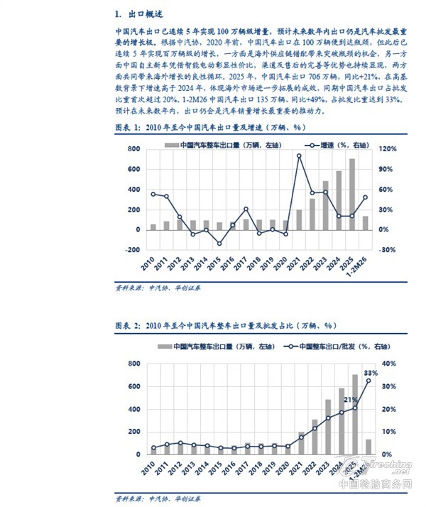 中国汽车出口已连续5 年实现100 万辆级增量。中国汽车出口提速始于2021年,一方面是海外供应链错配带来突破瓶颈的机会,另一方面中国自主新车凭借智能电动彰显性价比,渠道及售后的完善等优势也持续显现,两方面共同带来海外增长的良性循环。根据中汽协,2025 年中国汽车出口706 万辆,同比+21%,同期中国汽车出口占批发比重首次超过20%。1-2M26 中国汽车出口135 万辆、同比+49%,占批发比重达到33%。预计在未来数年内,出口仍会是汽车销量增长最重要的推动力。