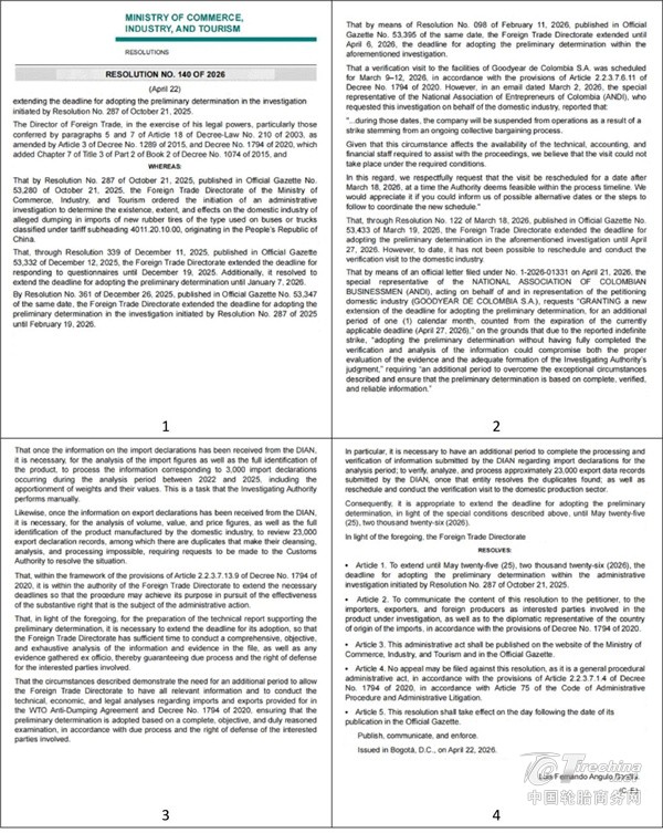 4月23日,哥伦比亚调查机关发布第140号决议,决定“对华新卡客车橡胶轮胎反倾销调查”的“初裁”延期至2026年5月25日;此前,该案初裁已先后四次延期(分别延至2026年1月7日、2月19日、4月6日和4月27日),本次为第五次延期。