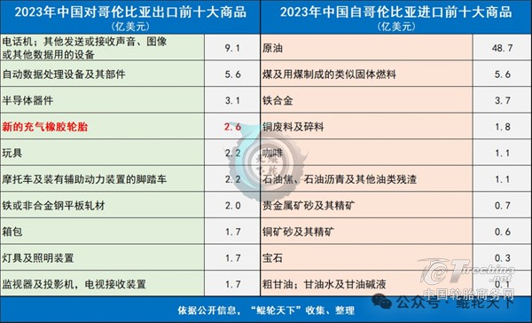 中国对哥伦比亚出口的前十大商品中,轮胎排第4。