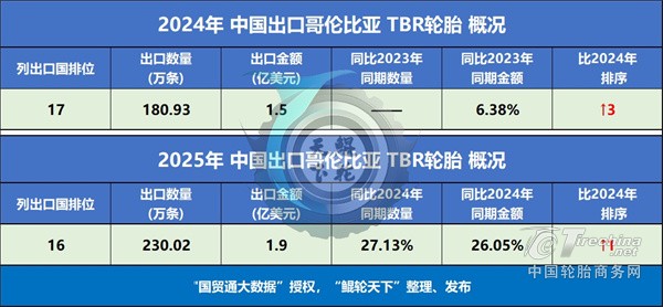 2025年中国出口哥伦比亚TBR轮胎230.02万条,金额1.9亿美元(同比增长26.05%);